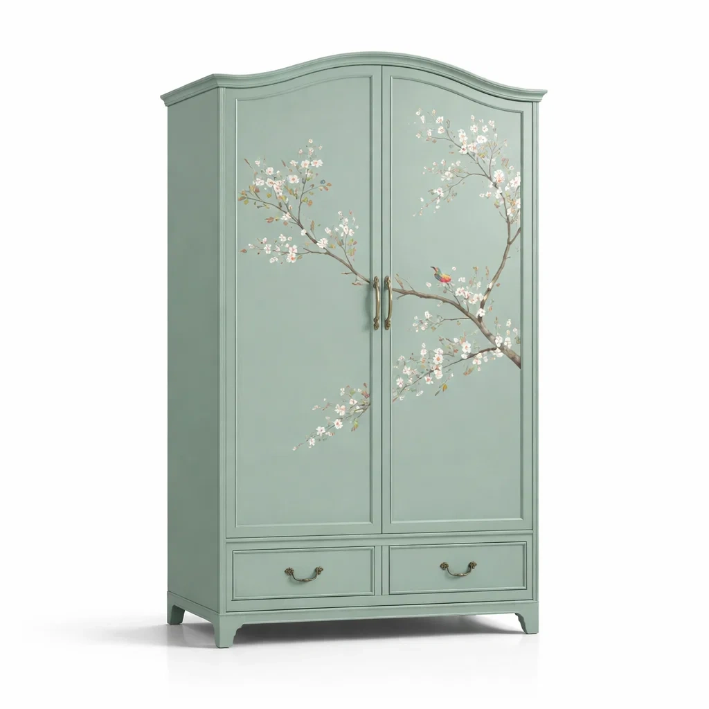 Armoire en bois massif peint avec motif floral vert clair 120x50x200 cm