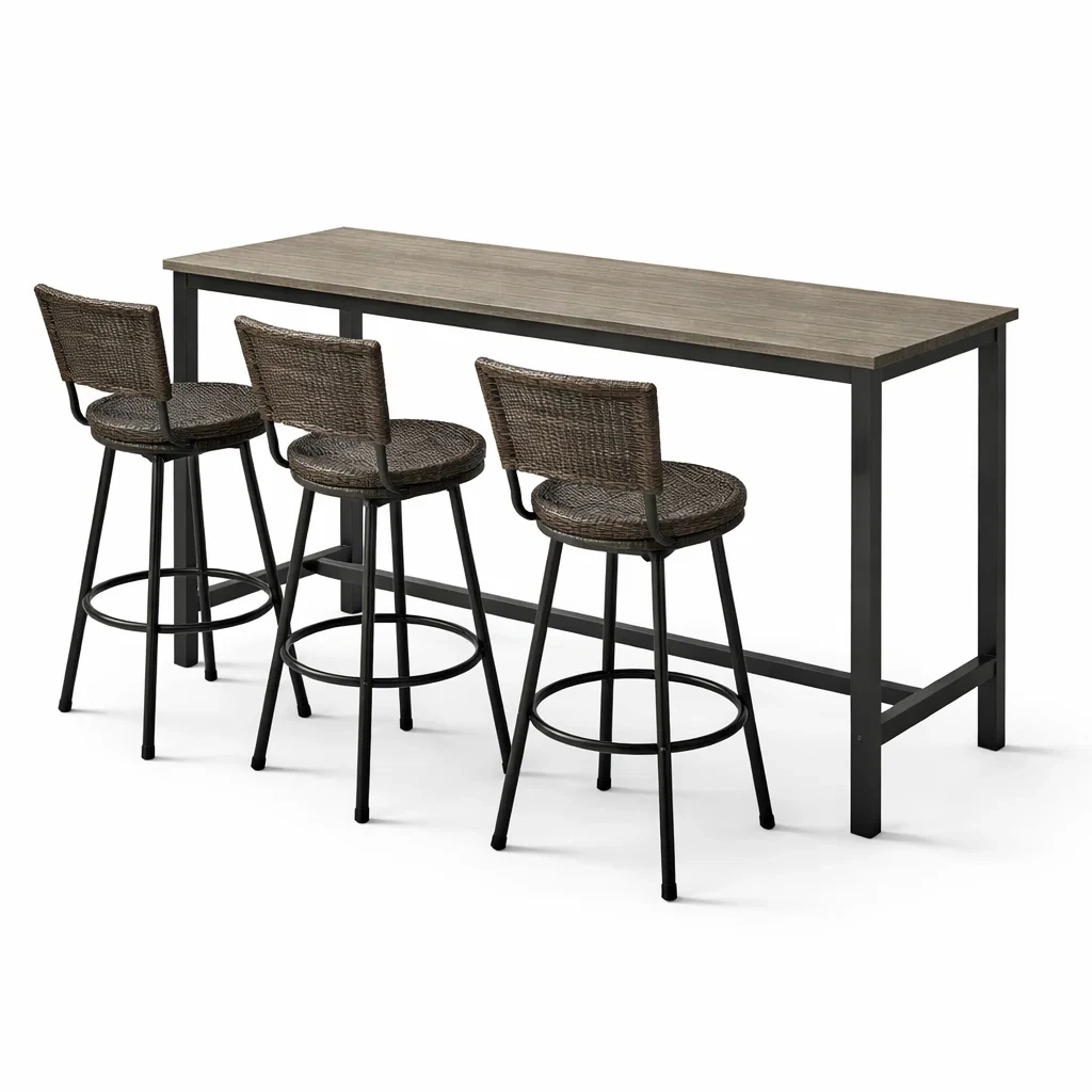 Ensemble de bar en métal avec table en bois et chaises en rotin