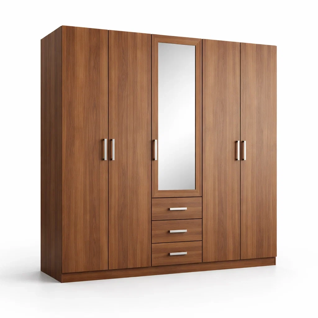 L'armoire est fabriquée en panneaux de particules avec une finition mélaminée. Elle présente une longueur de 180 cm, une largeur de 60 cm et une hauteur de 200 cm. L'armoire pèse 80 kg et est dotée de 5 portes et 3 tiroirs. Un miroir est intégré au design. Nettoyer avec un chiffon doux humidifié.
