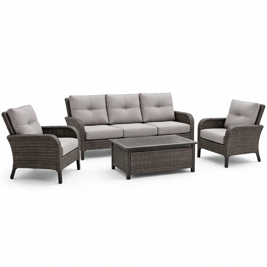 L'ensemble comprend un canapé 3 places, deux fauteuils et une table basse. La structure est en acier avec une résine tressée. Les coussins sont remplis de mousse haute densité et recouverts de polyester.