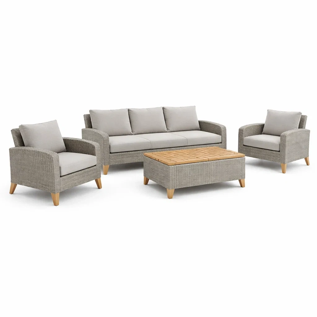Structure en rotin synthétique avec table en bois de teck. Coussins en polyester avec rembourrage en mousse.