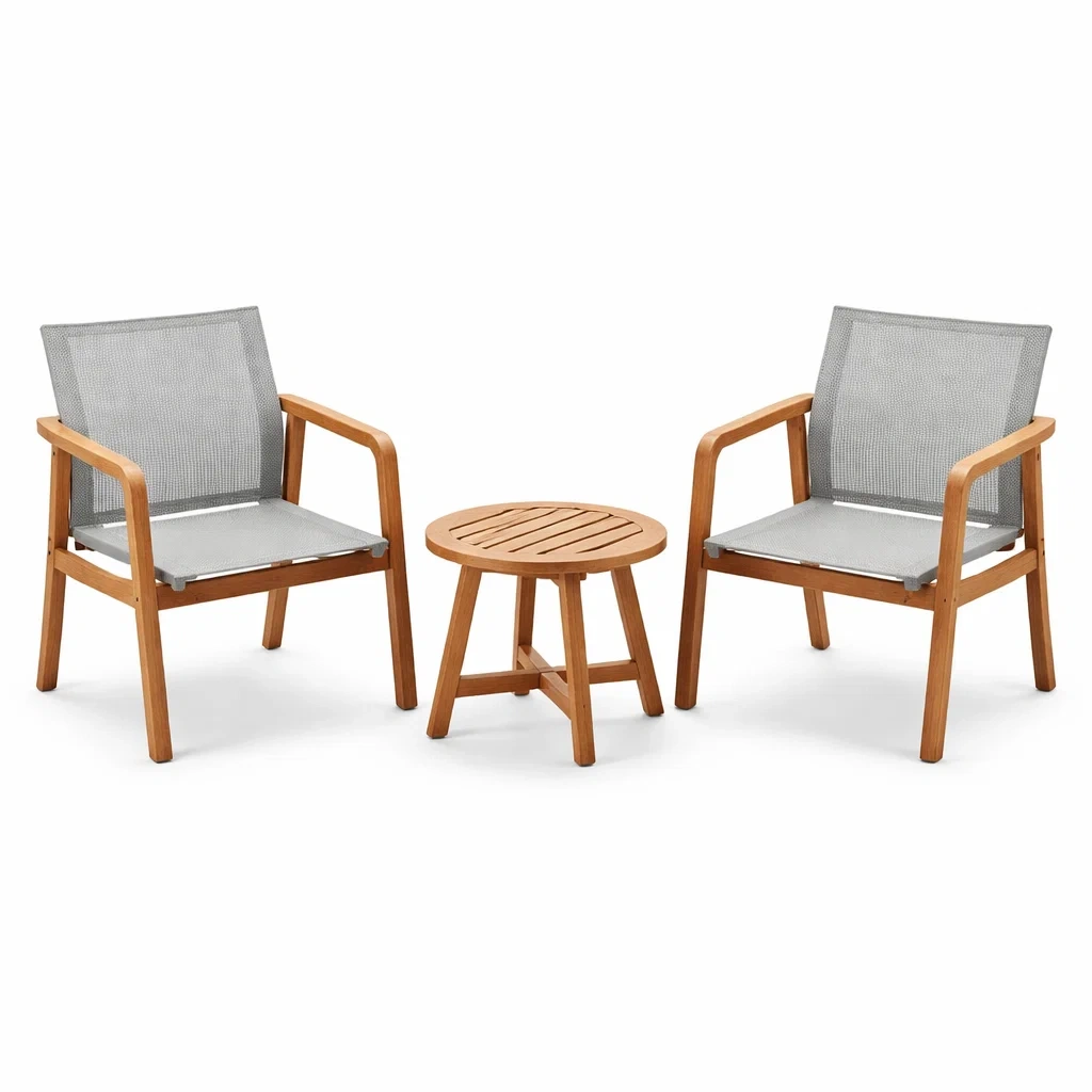 Les chaises ont une structure en bois d'acacia et une assise en textilène gris, offrant un soutien et une durabilité optimaux. La table, également en bois d'acacia, complète l'ensemble avec son design pratique.